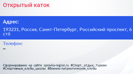 Открытый каток по адресу 193231, Россия, Санкт-Петербург, Российский проспект, 6 ст6 в дальнейшем Организация, размещена в следующих категориях: