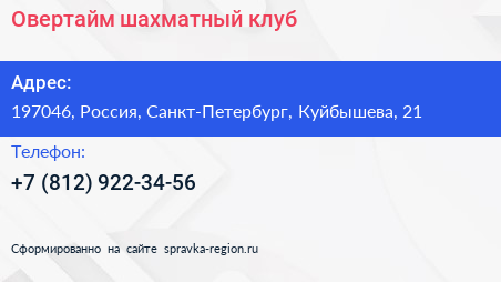 Овертайм, шахматный клуб по адресу 197046, Россия, Санкт-Петербург, Куйбышева, 21 в дальнейшем Организация, размещена в следующих категориях: