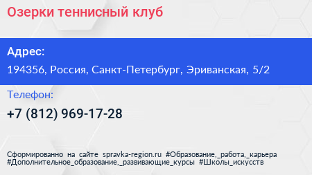 Озерки, теннисный клуб по адресу 194356, Россия, Санкт-Петербург, Эриванская, 5/2 в дальнейшем Организация, размещена в следующих категориях: