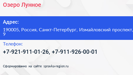 Озеро Лунное по адресу 190005, Россия, Санкт-Петербург, Измайловский проспект, 9 в дальнейшем Организация, размещена в следующих категориях: