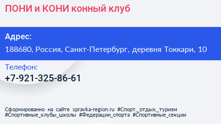 ПОНИ и КОНИ, конный клуб по адресу 188680, Россия, Санкт-Петербург, деревня Токкари, 10 в дальнейшем Организация, размещена в следующих категориях: