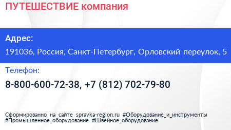 ПУТЕШЕСТВИЕ, компания по адресу 191036, Россия, Санкт-Петербург, Орловский переулок, 5 в дальнейшем Организация, размещена в следующих категориях: