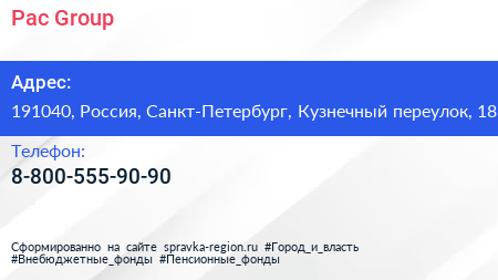 Pac Group по адресу 191040, Россия, Санкт-Петербург, Кузнечный переулок, 18 в дальнейшем Организация, размещена в следующих категориях: