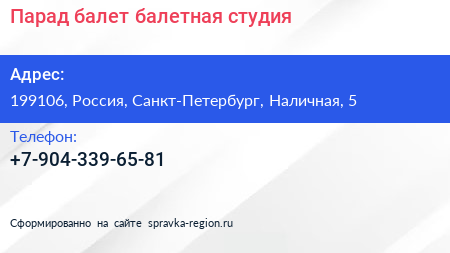 Парад балет, балетная студия по адресу 199106, Россия, Санкт-Петербург, Наличная, 5 в дальнейшем Организация, размещена в следующих категориях: