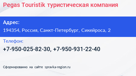 Pegas Touristik, туристическая компания по адресу 194354, Россия, Санкт-Петербург, Сикейроса, 2 в дальнейшем Организация, размещена в следующих категориях: