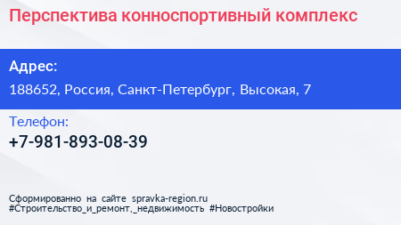 Перспектива, конноспортивный комплекс по адресу 188652, Россия, Санкт-Петербург, Высокая, 7 в дальнейшем Организация, размещена в следующих категориях: