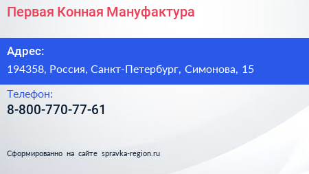 Первая Конная Мануфактура по адресу 194358, Россия, Санкт-Петербург, Симонова, 15 в дальнейшем Организация, размещена в следующих категориях: