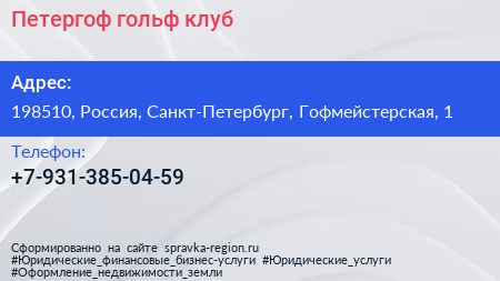 Петергоф, гольф-клуб по адресу 198510, Россия, Санкт-Петербург, Гофмейстерская, 1 в дальнейшем Организация, размещена в следующих категориях:
