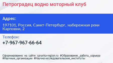 Петроградец, водно-моторный клуб по адресу 197101, Россия, Санкт-Петербург, набережная реки Карповки, 2 в дальнейшем Организация, размещена в следующих категориях: