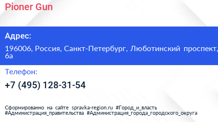 Pioner-Gun по адресу 196006, Россия, Санкт-Петербург, Люботинский проспект, 6а в дальнейшем Организация, размещена в следующих категориях:
