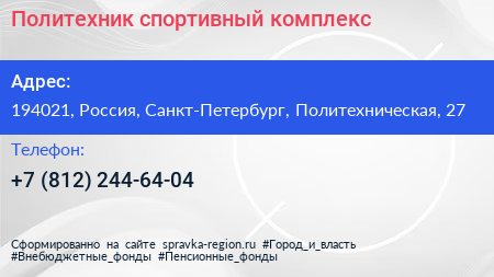Политехник, спортивный комплекс по адресу 194021, Россия, Санкт-Петербург, Политехническая, 27 в дальнейшем Организация, размещена в следующих категориях: