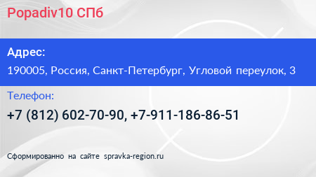 Popadiv10 СПб по адресу 190005, Россия, Санкт-Петербург, Угловой переулок, 3 в дальнейшем Организация, размещена в следующих категориях: