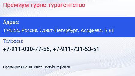 Премиум турне, турагентство по адресу 194356, Россия, Санкт-Петербург, Асафьева, 5 к1 в дальнейшем Организация, размещена в следующих категориях: