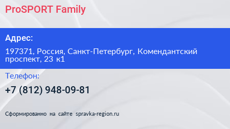 ProSPORT Family по адресу 197371, Россия, Санкт-Петербург, Комендантский проспект, 23 к1 в дальнейшем Организация, размещена в следующих категориях: