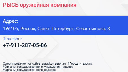 РЫСЬ, оружейная компания по адресу 196105, Россия, Санкт-Петербург, Севастьянова, 3 в дальнейшем Организация, размещена в следующих категориях: