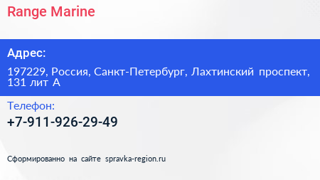Range Marine по адресу 197229, Россия, Санкт-Петербург, Лахтинский проспект, 131 лит А в дальнейшем Организация, размещена в следующих категориях: