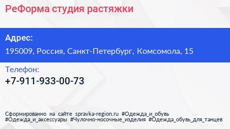 РеФорма, студия растяжки по адресу 195009, Россия, Санкт-Петербург, Комсомола, 15 в дальнейшем Организация, размещена в следующих категориях: