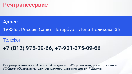 Речтрансcервис по адресу 198255, Россия, Санкт-Петербург, Лёни Голикова, 35 в дальнейшем Организация, размещена в следующих категориях:
