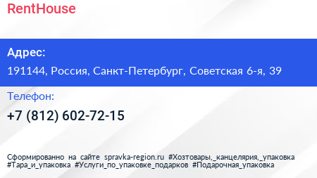 RentHouse по адресу 191144, Россия, Санкт-Петербург, Советская 6-я, 39 в дальнейшем Организация, размещена в следующих категориях: