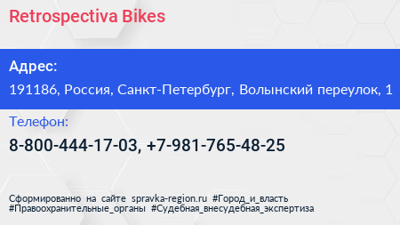 Retrospectiva Bikes по адресу 191186, Россия, Санкт-Петербург, Волынский переулок, 1 в дальнейшем Организация, размещена в следующих категориях: