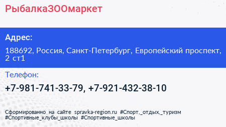 РыбалкаЗООмаркет по адресу 188692, Россия, Санкт-Петербург, Европейский проспект, 2 ст1 в дальнейшем Организация, размещена в следующих категориях: