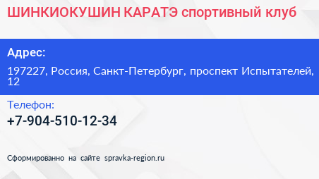 ШИНКИОКУШИН КАРАТЭ, спортивный клуб по адресу 197227, Россия, Санкт-Петербург, проспект Испытателей, 12 в дальнейшем Организация, размещена в следующих категориях: