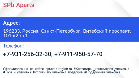 SPb Aparts по адресу 196233, Россия, Санкт-Петербург, Витебский проспект, 101 к2 ст1 в дальнейшем Организация, размещена в следующих категориях: