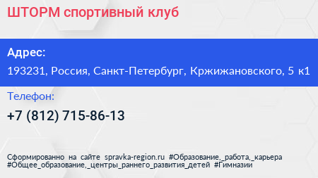 ШТОРМ, спортивный клуб по адресу 193231, Россия, Санкт-Петербург, Кржижановского, 5 к1 в дальнейшем Организация, размещена в следующих категориях: