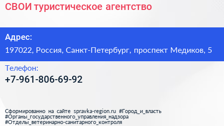 СВОИ, туристическое агентство по адресу 197022, Россия, Санкт-Петербург, проспект Медиков, 5 в дальнейшем Организация, размещена в следующих категориях: