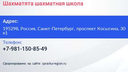 Шахматята, шахматная школа по адресу 195298, Россия, Санкт-Петербург, проспект Косыгина, 30 к1 в дальнейшем Организация, размещена в следующих категориях: