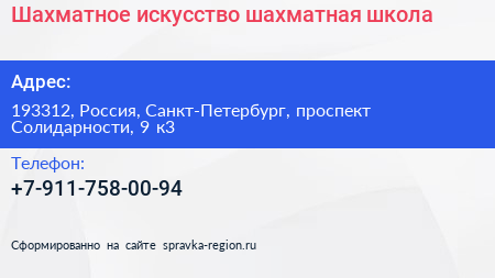 Шахматное искусство, шахматная школа по адресу 193312, Россия, Санкт-Петербург, проспект Солидарности, 9 к3 в дальнейшем Организация, размещена в следующих категориях: