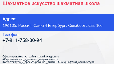 Шахматное искусство, шахматная школа по адресу 196105, Россия, Санкт-Петербург, Свеаборгская, 10а в дальнейшем Организация, размещена в следующих категориях: