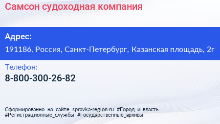 Самсон, судоходная компания по адресу 191186, Россия, Санкт-Петербург, Казанская площадь, 2г в дальнейшем Организация, размещена в следующих категориях: