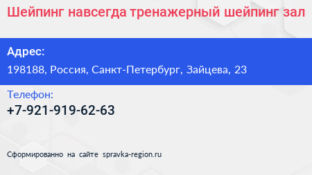 Шейпинг навсегда!, тренажерный шейпинг-зал по адресу 198188, Россия, Санкт-Петербург, Зайцева, 23 в дальнейшем Организация, размещена в следующих категориях: