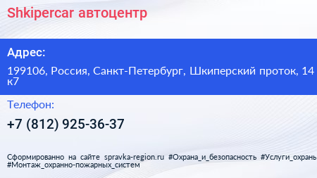 Shkipercar, автоцентр по адресу 199106, Россия, Санкт-Петербург, Шкиперский проток, 14 к7 в дальнейшем Организация, размещена в следующих категориях: