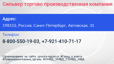 Сильвер, торгово-производственная компания по адресу 198152, Россия, Санкт-Петербург, Автовская, 31 в дальнейшем Организация, размещена в следующих категориях:
