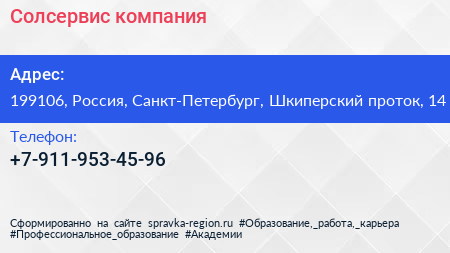 Солсервис, компания по адресу 199106, Россия, Санкт-Петербург, Шкиперский проток, 14 в дальнейшем Организация, размещена в следующих категориях: