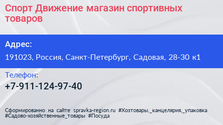 Спорт Движение, магазин спортивных товаров по адресу 191023, Россия, Санкт-Петербург, Садовая, 28-30 к1 в дальнейшем Организация, размещена в следующих категориях: