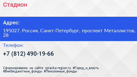 Стадион по адресу 195027, Россия, Санкт-Петербург, проспект Металлистов, 28 в дальнейшем Организация, размещена в следующих категориях: