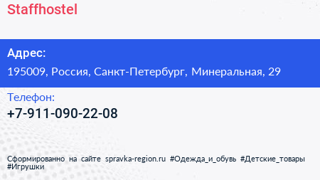 Staffhostel по адресу 195009, Россия, Санкт-Петербург, Минеральная, 29 в дальнейшем Организация, размещена в следующих категориях:
