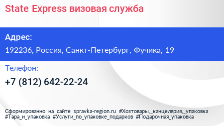 State-Express, визовая служба по адресу 192236, Россия, Санкт-Петербург, Фучика, 19 в дальнейшем Организация, размещена в следующих категориях:
