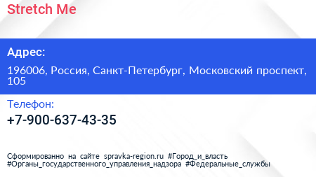 Stretch Me по адресу 196006, Россия, Санкт-Петербург, Московский проспект, 105 в дальнейшем Организация, размещена в следующих категориях: