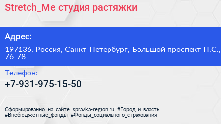 Stretch_Me, студия растяжки по адресу 197136, Россия, Санкт-Петербург, Большой проспект П.С., 76-78 в дальнейшем Организация, размещена в следующих категориях: