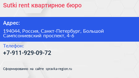 Sutki.rent, квартирное бюро по адресу 194044, Россия, Санкт-Петербург, Большой Сампсониевский проспект, 4-6 в дальнейшем Организация, размещена в следующих категориях: