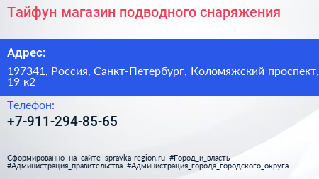Тайфун, магазин подводного снаряжения по адресу 197341, Россия, Санкт-Петербург, Коломяжский проспект, 19 к2 в дальнейшем Организация, размещена в следующих категориях: