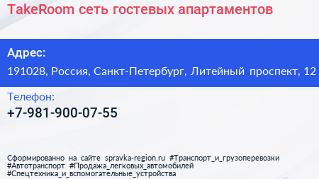 TakeRoom, сеть гостевых апартаментов по адресу 191028, Россия, Санкт-Петербург, Литейный проспект, 12 в дальнейшем Организация, размещена в следующих категориях: