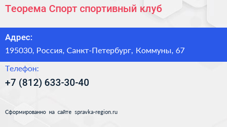 Теорема Спорт, спортивный клуб по адресу 195030, Россия, Санкт-Петербург, Коммуны, 67 в дальнейшем Организация, размещена в следующих категориях: