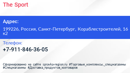 The Sport по адресу 199226, Россия, Санкт-Петербург, Кораблестроителей, 16 к2 в дальнейшем Организация, размещена в следующих категориях: