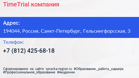 TimeTrial, компания по адресу 194044, Россия, Санкт-Петербург, Гельсингфорсская, 3 в дальнейшем Организация, размещена в следующих категориях: