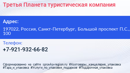 Третья Планета, туристическая компания по адресу 197022, Россия, Санкт-Петербург, Большой проспект П.С., 100 в дальнейшем Организация, размещена в следующих категориях: